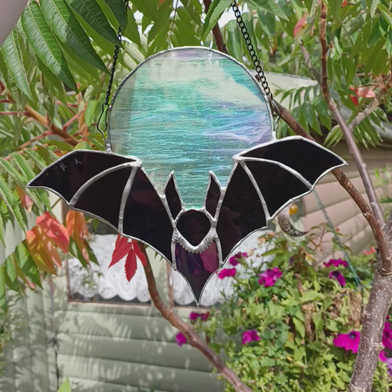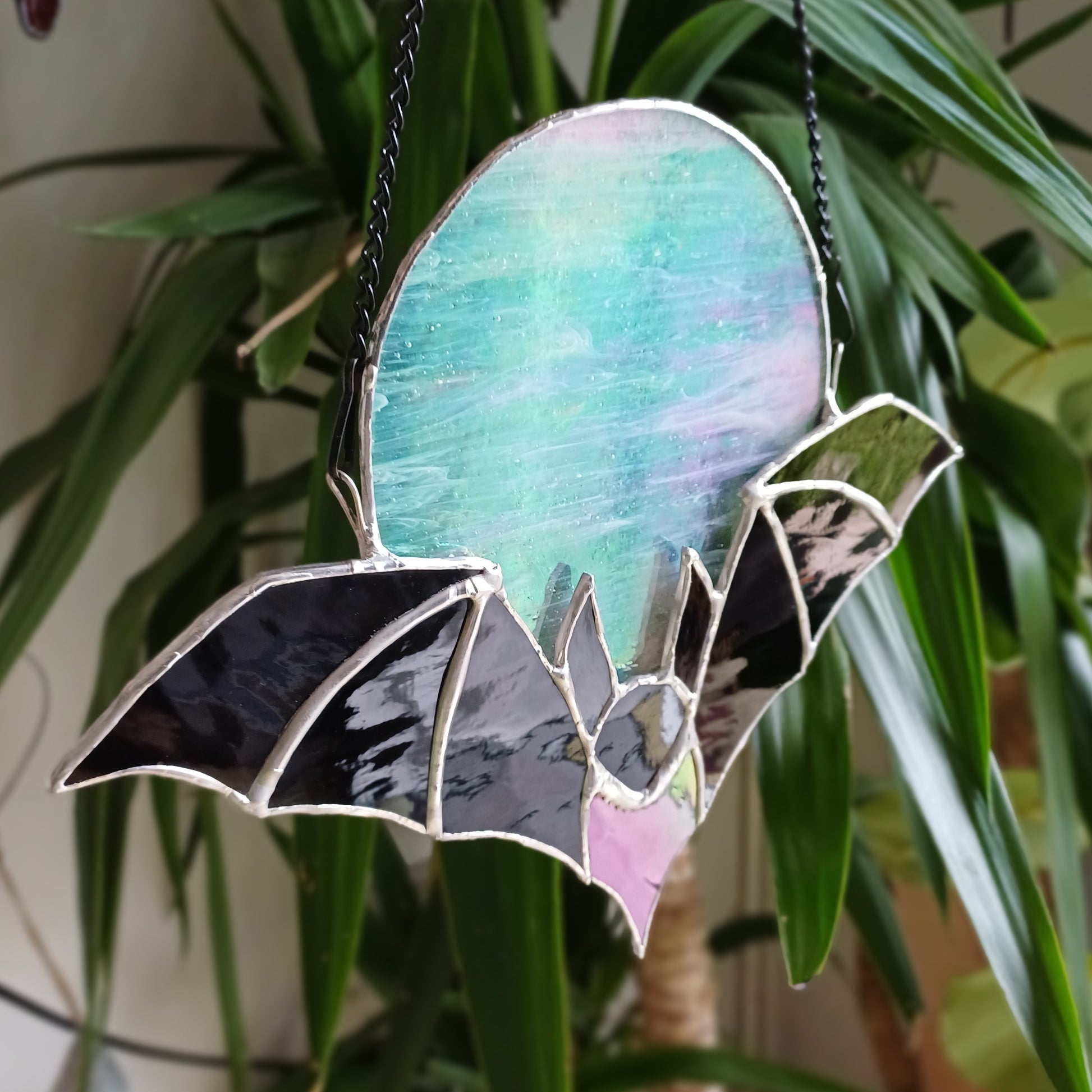 The Bat Moon design showcases a black bat with a vivid purple body soaring gracefully before a full moon. The iridescent moon features wispy clouds with pink, green, and blue hues that change with the light.