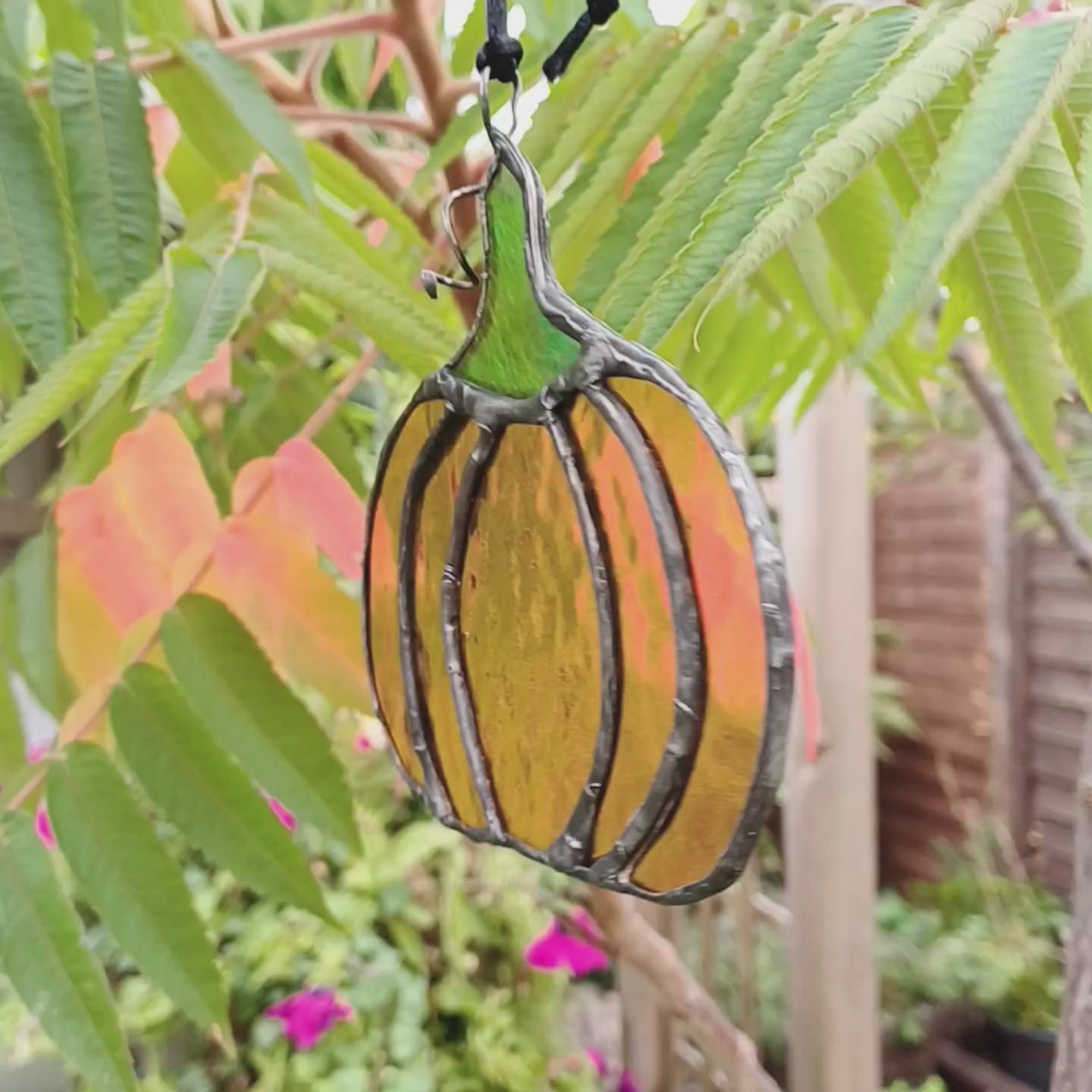 Give your window a burst of autumn warmth with this chunky Glass Pumpkin Suncatcher. Handmade from textured glass, featuring a green stem and bright orange shades, it catches the light to create a cozy, enchanting glow. A fun and festive way to bring handmade charm to any space.