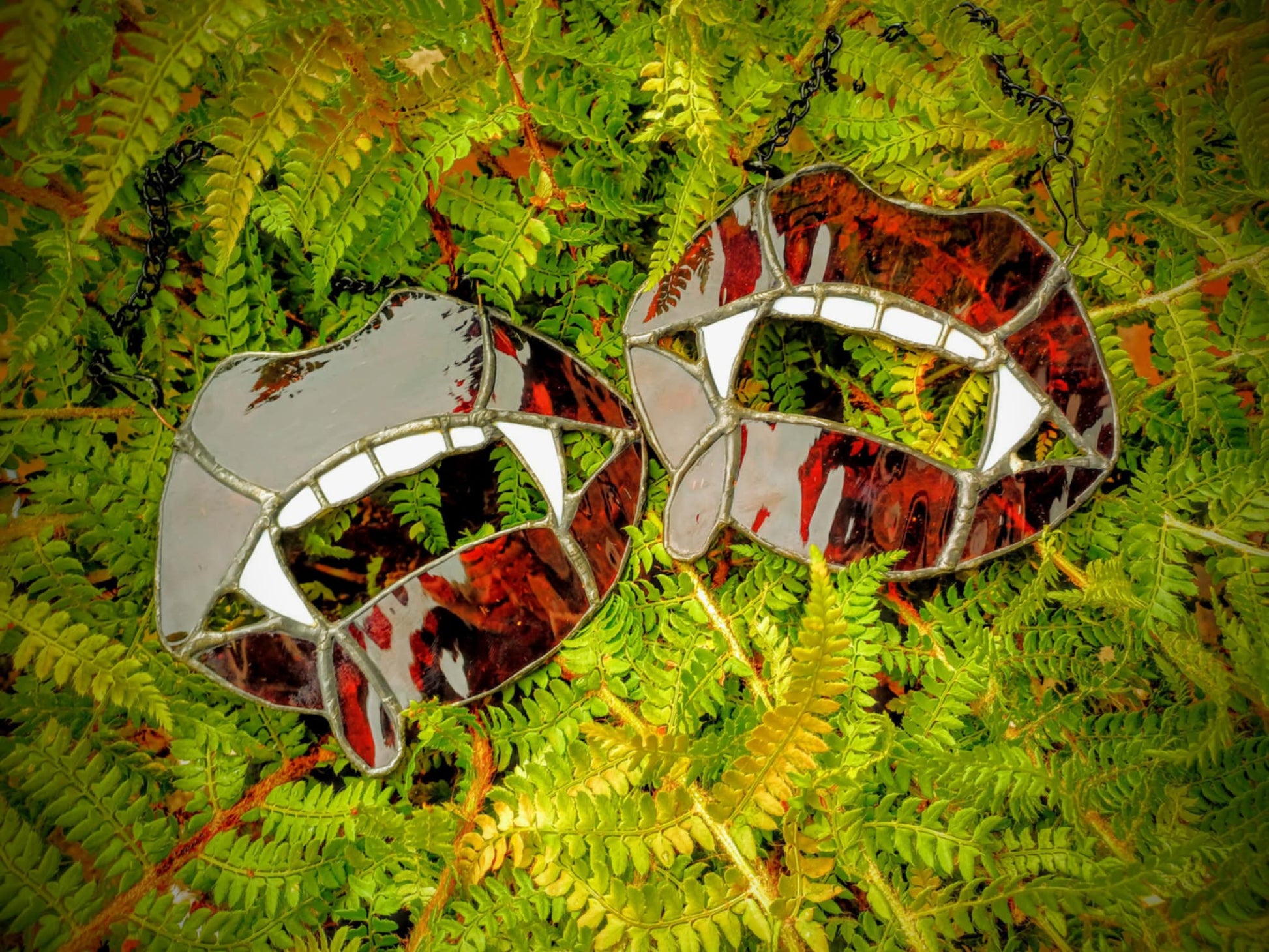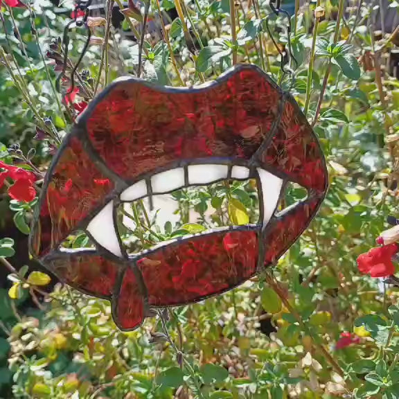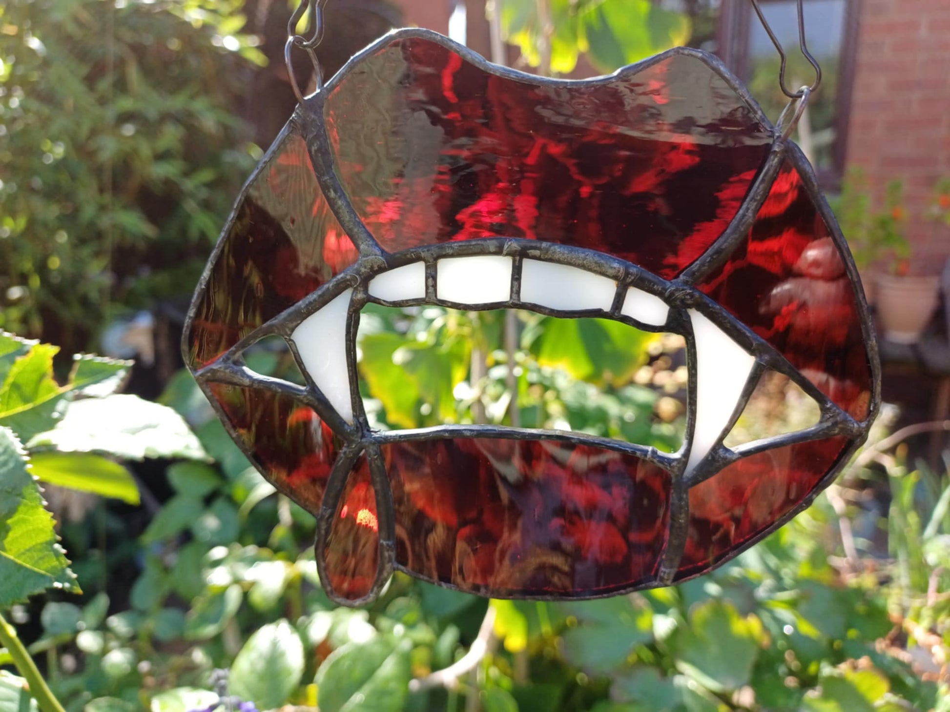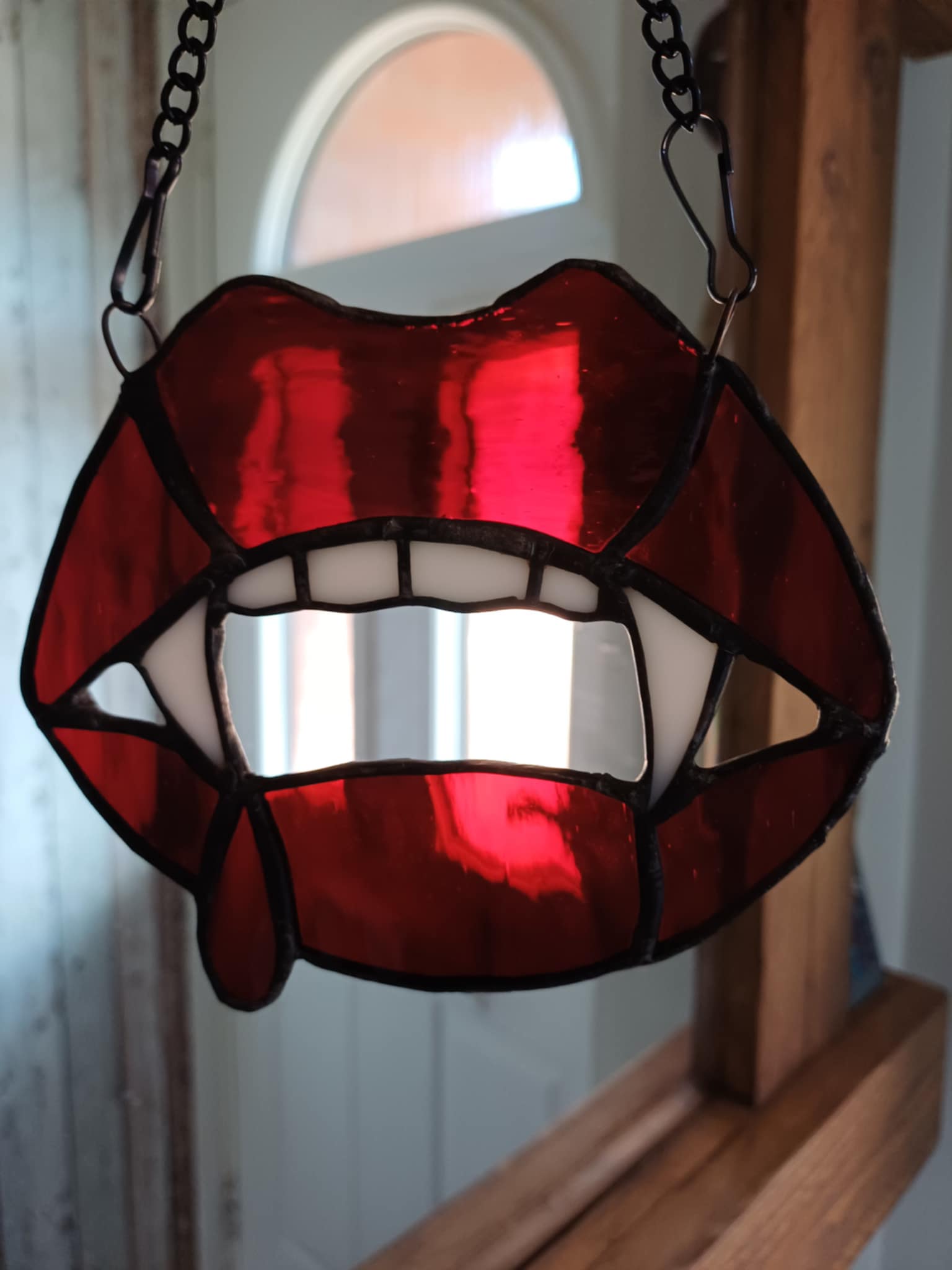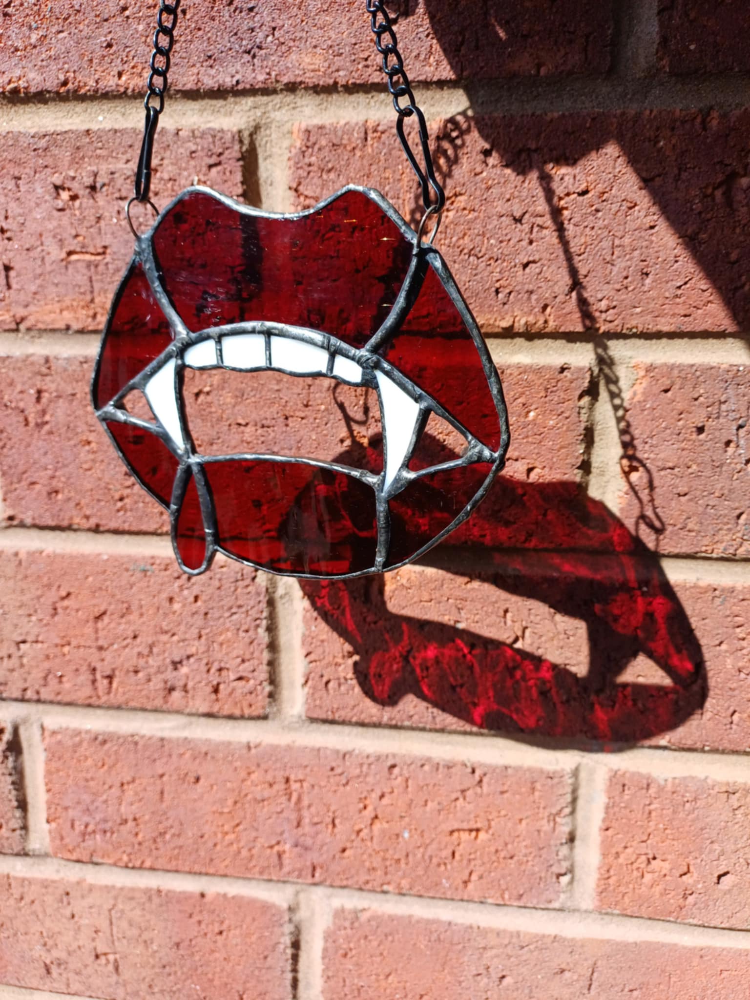 The Vampire's Kiss design showcases glossy, deep red lips with a sharp bite mark, pronounced fangs, and a subtle drop of blood, encapsulating the quintessential vampire allure. This expertly crafted image combines vivid color and fine detail to evoke a darkly seductive and mysterious atmosphere, perfect for those drawn to gothic elegance and dramatic expression.